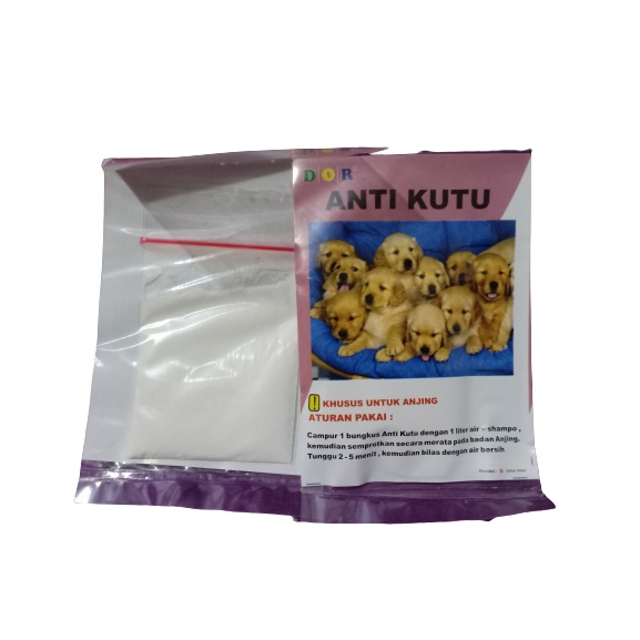 Bedak Kutu Anjing ANTI KUTU Anjing Merk : DOR Harga yang tertera untuk 1 bungkus yaa Aturan pakai : campur 1 bungkus Anti Kutu dengan 1 liter Air + shampoo, kemudian semprotkan secara merata pada badan Anjing. Tunggu 2 - 5 menit, kemudian bilas dengan air bersih