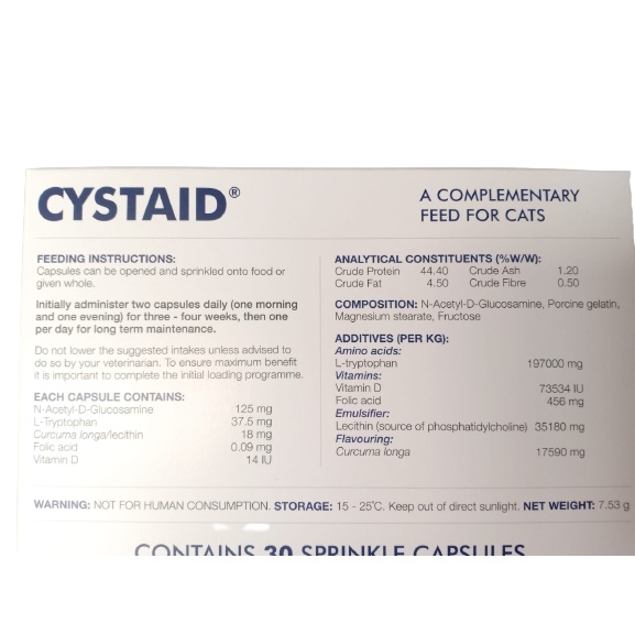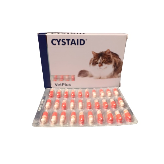 HARGA UNTUK 1 KAPSUL yaa Cystaid Plus merupakan suplemen untuk menjaga saluran kemih / saluran pipis kucing kesayangan kamu. Tanda-tanda ada masalah pada saluran kemih / kucing kamu : - susah pipis, ke pasir terus tapi ga ada pipisnya / pipis dikit-dikit - ada darah pada pipisnya - si kucing kesakitan ketika pipis Cystaid Plus dapat digunakan dalam jangka pendek maupun jangka panjang. Kapsul dapat dibuka dan dicampurkan dengan makanan atau langsung diberikan kepada kucing Kapsul dapat diberikan 2 kali sehari untuk 3 - 4 minggu, lalu 1 kali sehari jika membutuhkan suplemen jangka panjang