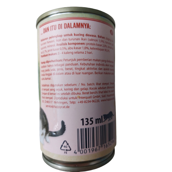 Makanan / Minuman Kucing Cat Drink Merk : Happy Cat Minkas Cat Drink Ukuran : 135ml Happy Cat Minkas Cat Drink adalah minuman kucing yang diformulasikan untuk memenuhi asupan cairan sehari-hari. Dengan potongan daging kecil yang lezat, minuman ini membangkitkan selera kucing untuk minum. Minuman kucing cocok dikonsumsi bagi kucing yang malas minum atau diberikan sebagai cemilan. - Tekstur cair dengan ikan salmon. - Mencegah dehidrasi. - Grain free & tanpa gula tambahan. - Tanpa susu (bebas laktosa). - Mencegah penyakit saluran kemih. - Tanpa pengawet dan perasa tambahan.