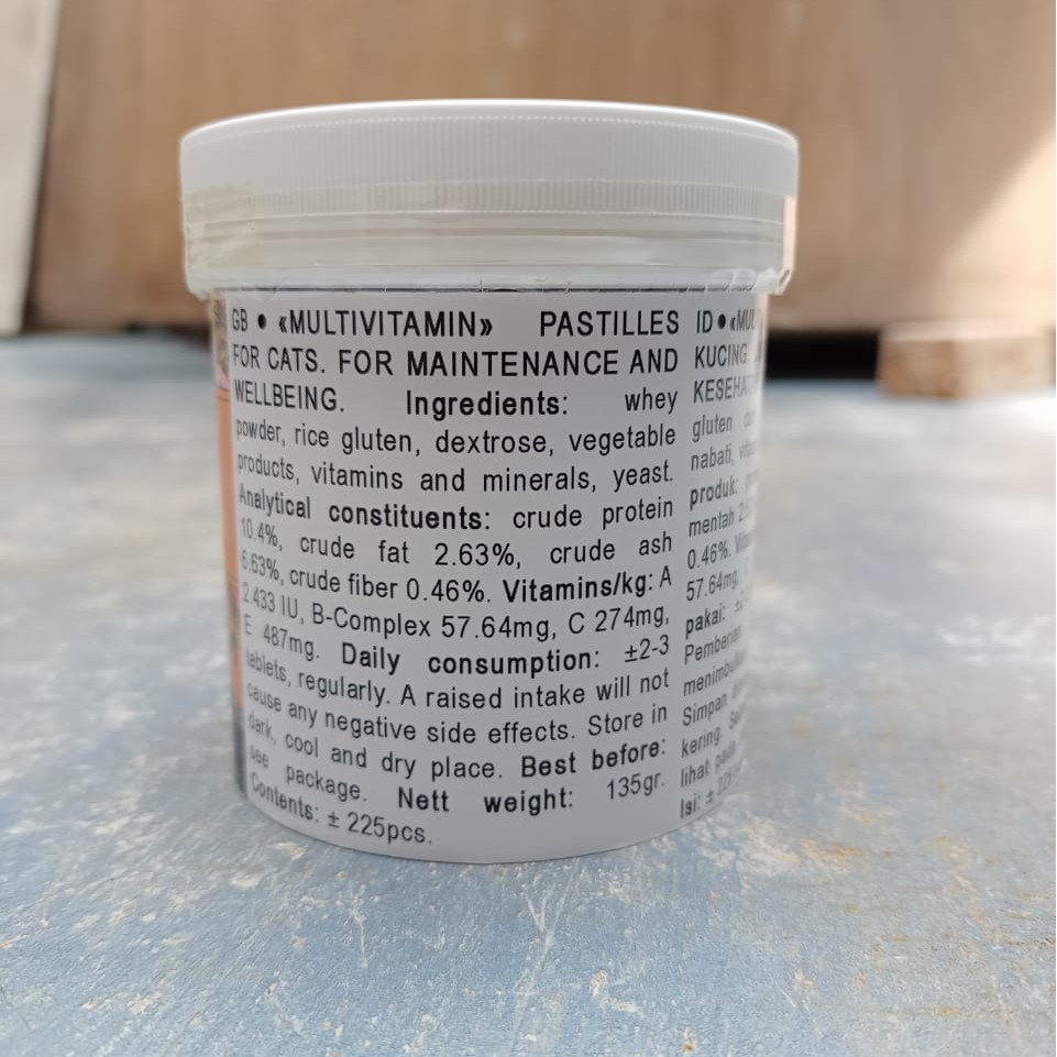 KEMASAN REPACK YA Vitamin Kucing Suplemen Kucing Multivitamin untuk Kucing Merk : Kis-Kis KEMASAN REPACK 1 pack isi 5 butir harga yang tertera untuk 1 pack yaa PROTEIN : 10,4% FAT : 2,6% MADE IN HOLLAND Manfaat : • Memelihara kesehatan tubuh. • Direkomendasikan untuk membantu penyembuhan saat sakit atau setelah operasi. • Mengandung vitamin A, B-Complex, dan vitamin C, serta mineral. • Meningkatkan nafsu makan. • Menstimulasi sistem imun. • Rasa lezat sehingga dapat dimakan secara langsung. cara pakai : bisa ditumbuk / gerus dan ditaburkan di makanan, atau mau dikasih langsung ke mulut kucing juga bisa gunakan 2 - 3 tablet dalam sehari, penggunaan jangka panjang tidak memiliki efek samping.