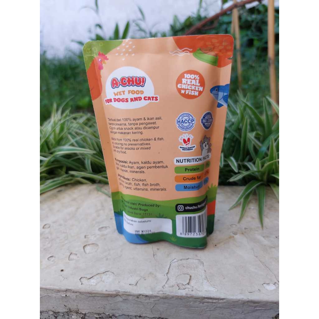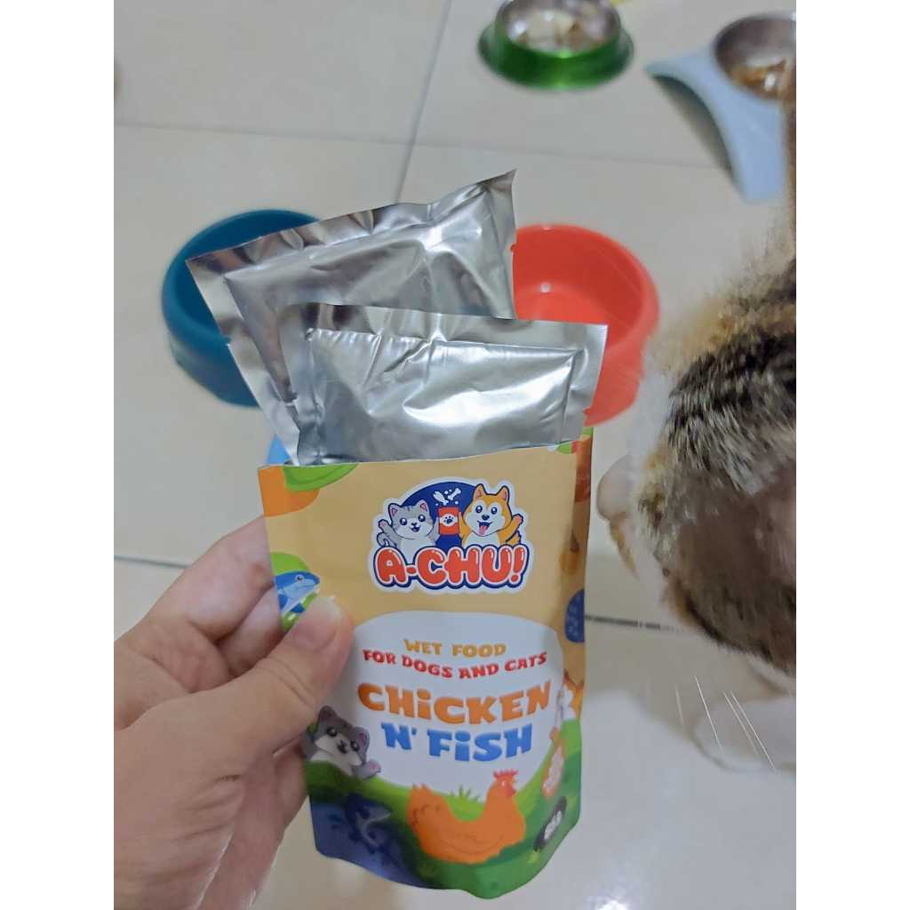 Makanan Basah Kucing / Anjing Merk : Achu Varian : Chicken n Fish Ukuran : 85gr tersedia varian lainnya : tuna fish, chicken and fish, ocean fish * untuk varian tuna wangi nya agak lebih menyengat yaa ~ Diproduksi oleh: PT. Rijae Industri Boga - Bekasi, Indonesia