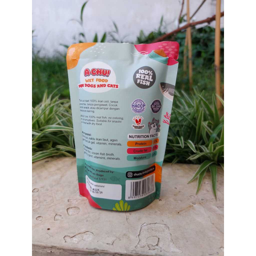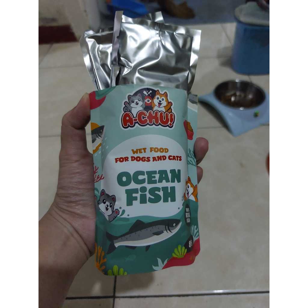 Makanan Basah Kucing / Anjing Merk : Achu Varian : Ocean Fish Ukuran : 85gr tersedia varian lainnya : tuna fish, chicken and fish, ocean fish * untuk varian tuna wangi nya agak lebih menyengat yaa ~ Diproduksi oleh: PT. Rijae Industri Boga - Bekasi, Indonesia