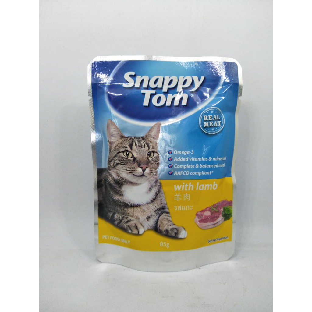 Snappy Tom Pouch 85gr Varian : - Chicken - With Lamb - With Beef & Vegetable - Pilchard & Sea Bream (White Fish) in Jelly - Tuna & Shrimp in Jelly - Tuna in Jelly - Pilchard & Snapper in Jelly Protein Mentah (Min) 7.0%-10% Lemak Kasar (Min) 2.0%-5.0% Serat Kasar (Max) 1.0% Garam (Max) (Terjadi Secara Alami) 1.0%