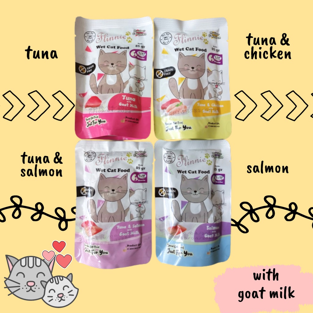 Makanan Kucing Basah Makanan Kucing Pouch Makanan Kucing Kitten Merk : Flinnie - Mother and Kitten Ukuran : 85 gr tersedia varian : tuna, tuna with chicken, tuna and salmon, salmon silahkan pilih varian yang diinginkan, jika varian kosong, maka akan kami konfirmasi lebih lanjut (jika tidak ada balasan akan kami kirim sesuai stok yang ada yaa ~)