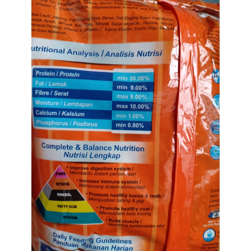 Makanan Kucing Kering Makanan Kucing Dewasa Merk : PRODIET Ukuran : 500 gr Varian : Ocean Fish · Untuk kucing dewasa di atas 2 tahun ke atas · Diet Lengkap dan Seimbang untuk semua nutrisi yang dibutuhkan untuk pertumbuhan pada tahap dewasa · Dimasukkannya minyak Tuna untuk sumber yang kaya Omega 3 dan Omega 6 membantu mengembangkan fungsi otak dan saraf, dan bulu yang lebih berkilau dan lebih tebal · Ditambahkan Yucca Schidigera untuk menjaga kinerja pencernaan yang baik dan kontrol bau kotoran · Kibble berbentuk E yang unik untuk kesehatan gigi - menghilangkan plak & karang gigi · Serat campuran alami untuk mengontrol dan meminimalkan masalah bola rambut dengan lebih baik · Taurin untuk peningkatan penglihatan