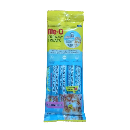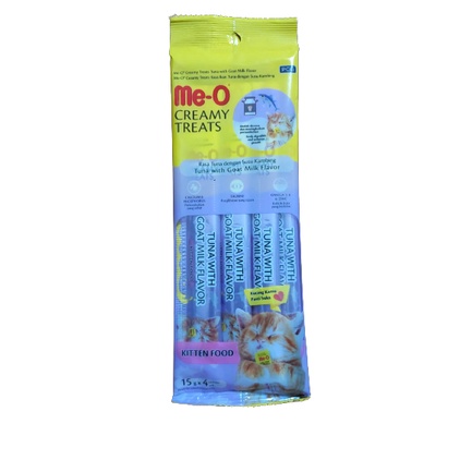 Snack kucing cair Snack Kitten merk : MEO Creamy Treats ukuran : 1 pack isi 4 pcs @15gr tersedia varian : - tuna with goat milk - chicken liver with goat milk silahkan pilih varian yang diinginkan, bila stoknya kosong, akan kami konfirmasi lebih lanjut