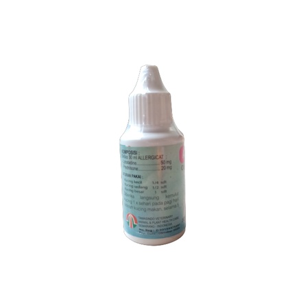 Obat Kucing Alergi Obat Alergi Kucing merk : ALERGICAT ukuran : 30 ml digunakan untuk mengatasi segala alergi yang disebabkan oleh makanan, serbuk, kutu atau parasit seperti jamur gejala - gejala : indikator kucing alergi : kulit kering ada keropeng kecil, kucing terus menggaruk, gatal, memerah atau tampak meradang pada wajah, perut, bagian paha. Dampak dari alergi kulit kucing pitak dan bulu rontok. aturan pakai : - kucing kecil 1/4 sdt - kucing sedang : 1/2 sdt - kucing besar : 1 sdt anjuran : kucing diistirahatkan dan diisolasi atau dikarantina: