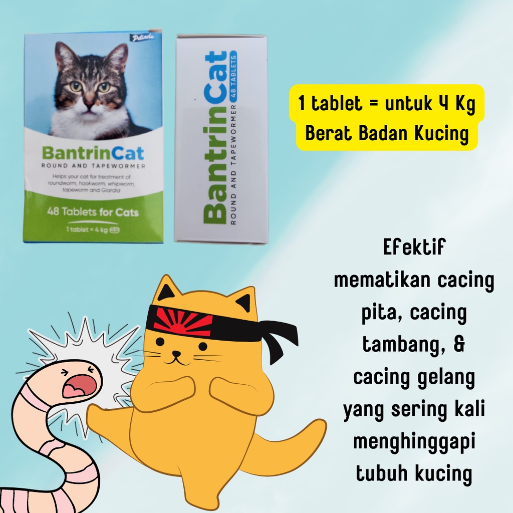 Obat Cacing Kucing Obat Kucing Cacingan Merk : Bantrin Cat Harga yang tertera untuk 1 tablet 1 tablet untuk 4kg kucing ** Jadi kalo kucingnya 2kg, 1/2 tablet aja yaa** Tablet diberikan secara oral (dalam bentuk tablet atau dihancurkan jadi bubuk) Alat bantu lain dapat digunakan untuk memberikan Bantrin Cat ke kucing. Yakni dengan menggunakan suntikan (tanpa jarum) yang dapat dibeli di apotik. Caranya bagi tablet Bantrin Cat sesuai dosis (berdasarkan berat badan kucing), haluskan kemudian larutkan dalam 5mL air dan masukkan ke dalam suntikan (tanpa jarum). REKOMENDASI PENGOBATAN : Anak Kucing : Berikan Bantrin Cat pada usia 6, 8, 10 dan 12 minggu dan kemudian 1 bulan sampai 6 bulan. Setelah itu setiap 3 bulan atau sesuai saran dokter hewan. Kucing menyusui : Sebaiknya diobati secara bersamaan dengan anak kucing. Dewasa : Berikan Bantrin Cat setiap 3 bulan sekali