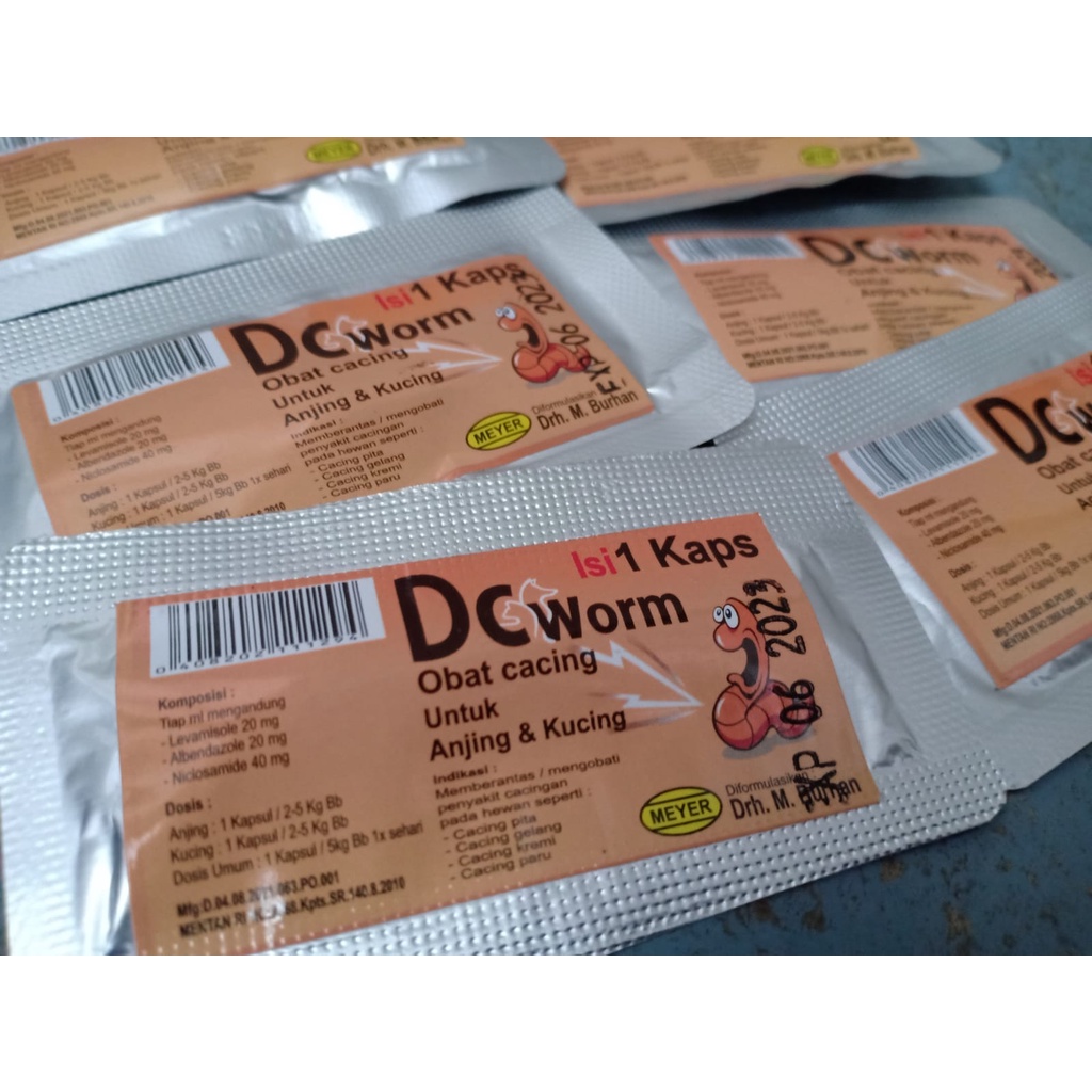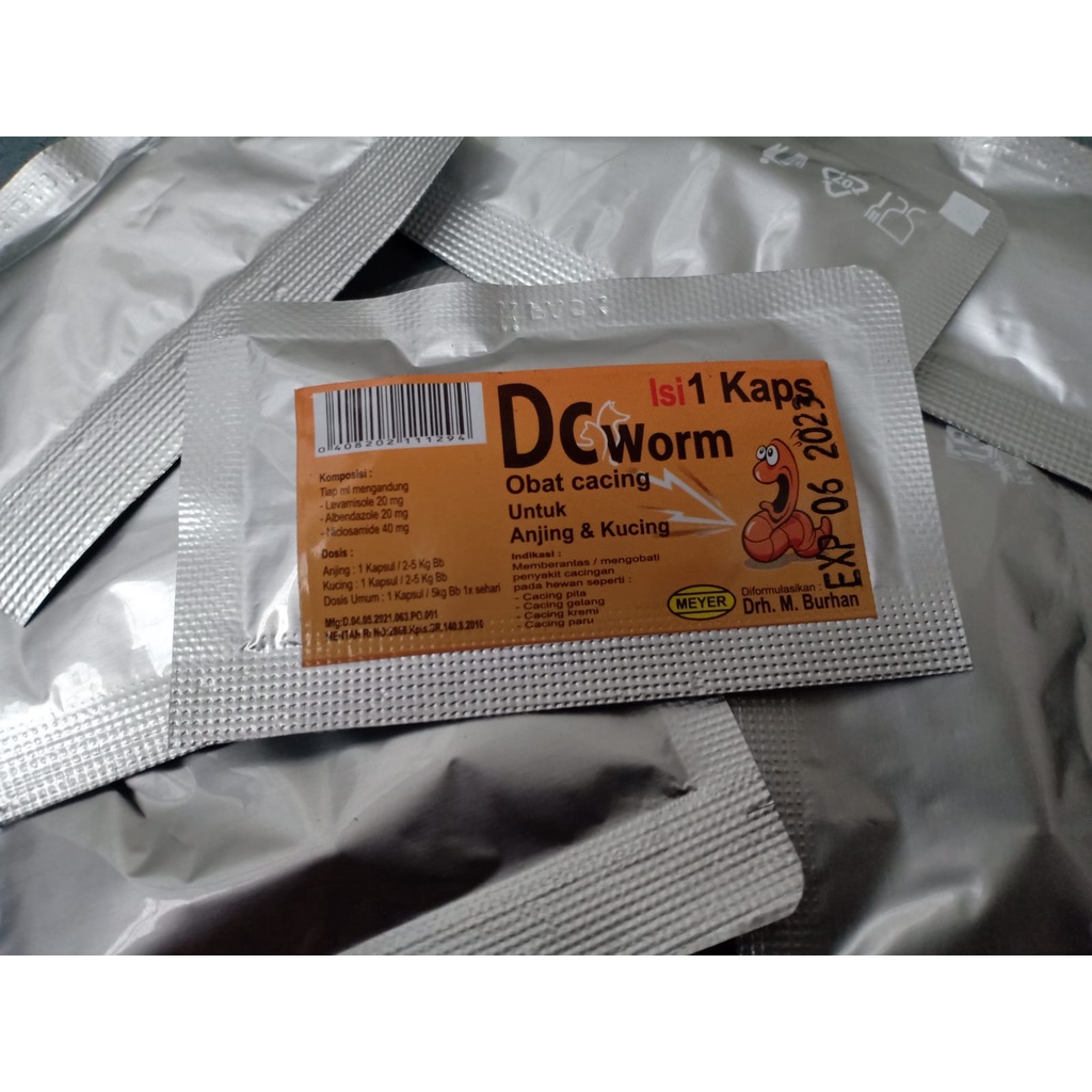 Obat Cacing Kucing / Anjing Obat Kucing / Anjing Cacingan Merk : DC WORMS - 1 kapsul HARGA YANG TERTERA UNTUK 1 KAPSUL YA (1 sachet isi 1 kapsul) Indikasi : Memberantas Penyakit Cacingan - Cacing Pita - Cacing Gelang - Cacing Kremi - Cacing paru Dosis: - Anjing : 1 Kapsul / 2-5 Kg Bb - Kucing : 1 Kapsul / 2-5 Kg Bb Dosis Umum : 1 Kapsul / 5kg Bb 1x sehari Produksi : Meyer Mfg:D.04.08.2021.063.PO.001 MENTAN RI NO:2868.Kpts.SR.140.8.2010 Di formulasikan oleh DRH M BURHAN