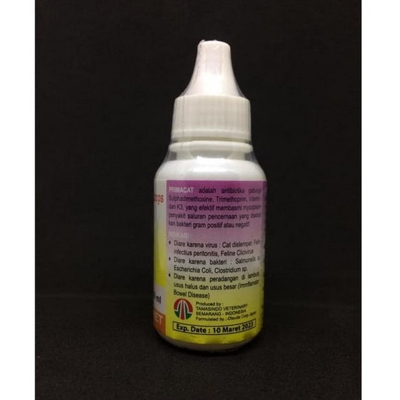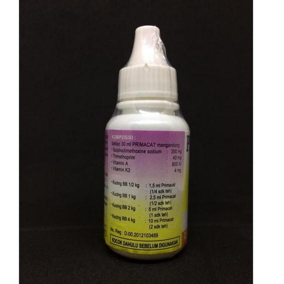 PRIMA CAT 30 ml (Obat Diare pada Kucing) Formulated by Otsuda Japan adalah antibiotika gabungan Sulphameditorine, Trimethoprin, Vitamin A dan K3 yg efektif membasmi mycoplasma penyakit saluran pencernaan yg disebabkan bakteri gram postif atau negatif Indikasi : Diare atau mencret karena bakteri,protozoa, virus, pancreatitis dan inflamatory bowel disease (peradangan lambung dan usus) Cara Pemakaian : Kucing BB 1/2 kg : 1.5 ml Prima cat ( 1/4 sdk teh ) Kucing BB 1 kg : 2.5 ml Prima cat ( 1/2 sdk teh ) Kucing BB 2 kg : 5 ml Prima cat ( 1 sdk teh ) Kucing BB 4 kg : 10 ml Prima cat ( 2 sdk teh )