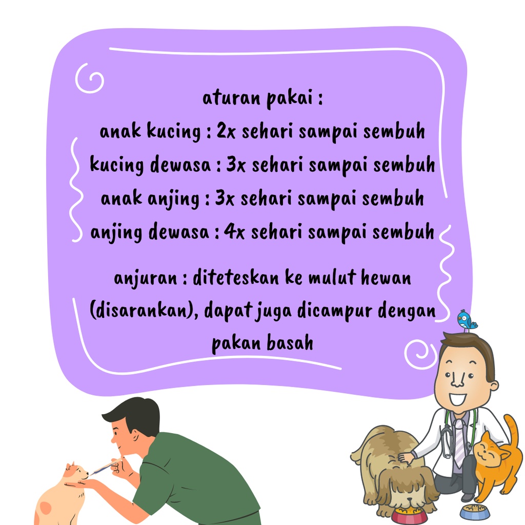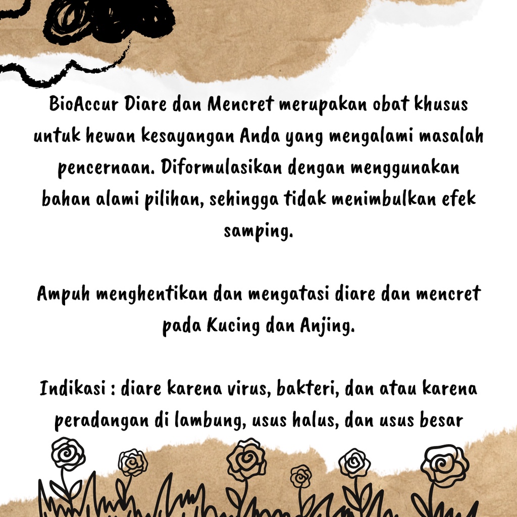 Obat Diare Kucing Obat Diare Anjing Merk : BIOACCUR - Diare dan Mencret Ukuran : 30ml BioAccur Diare dan Mencret merupakan obat khusus untuk hewan kesayangan Anda yang mengalami masalah pencernaan. Diformulasikan dengan menggunakan bahan alami pilihan, sehingga tidak menimbulkan efek samping. Ampuh menghentikan dan mengatasi diare dan mencret pada Kucing dan Anjing. Indikasi : diare karena virus, bakteri, dan atau karena peradangan di lambung, usus halus, dan usus besar aturan pakai : anak kucing : 2x sehari sampai sembuh kucing dewasa : 3x sehari sampai sembuh anak anjing : 3x sehari sampai sembuh anjing dewasa : 4x sehari sampai sembuh anjuran : diteteskan ke mulut hewan (disarankan), dapat juga dicampur dengan pakan basah