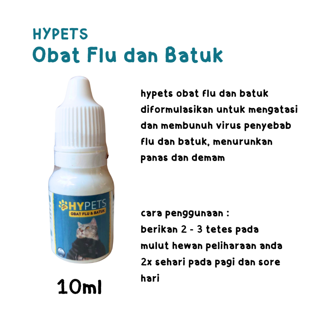 Obat Flu dan Batuk Kucing / Anjing merk : HYPETS ukuran : 10ml hypets obat flu dan batuk diformulasikan untuk mengatasi dan membunuh virus penyebab flu dan batuk, menurunkan panas dan demam. cara penggunaan : berikan 2 - 3 tetes pada mulut hewan peliharaan anda 2x sehari pada pagi dan sore hari