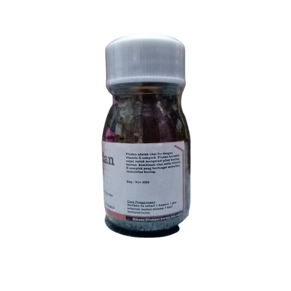 Obat Flu Kucing Obat Pilek Kucing Merk : FLUDAN Ukuran : 1 botol (isi 21 kapsul) digunakan untuk mengobati flu, bersin-bersin, hidung dan mata berair Fludan adalah obat flu dengan vitamin B komplek. Fludan bereaksi cepat untuk mengatasi pilek kucing karena kombinasi obat serta vitamin B komplek yang berfungsi meningkatkan imunitas kucing. Cara penggunaan : berikan 3x sehari 1 kapsul, 1 jam sebelum makan selama 7 hari berturut-turut **simpan di tempat kering dan sejuk**