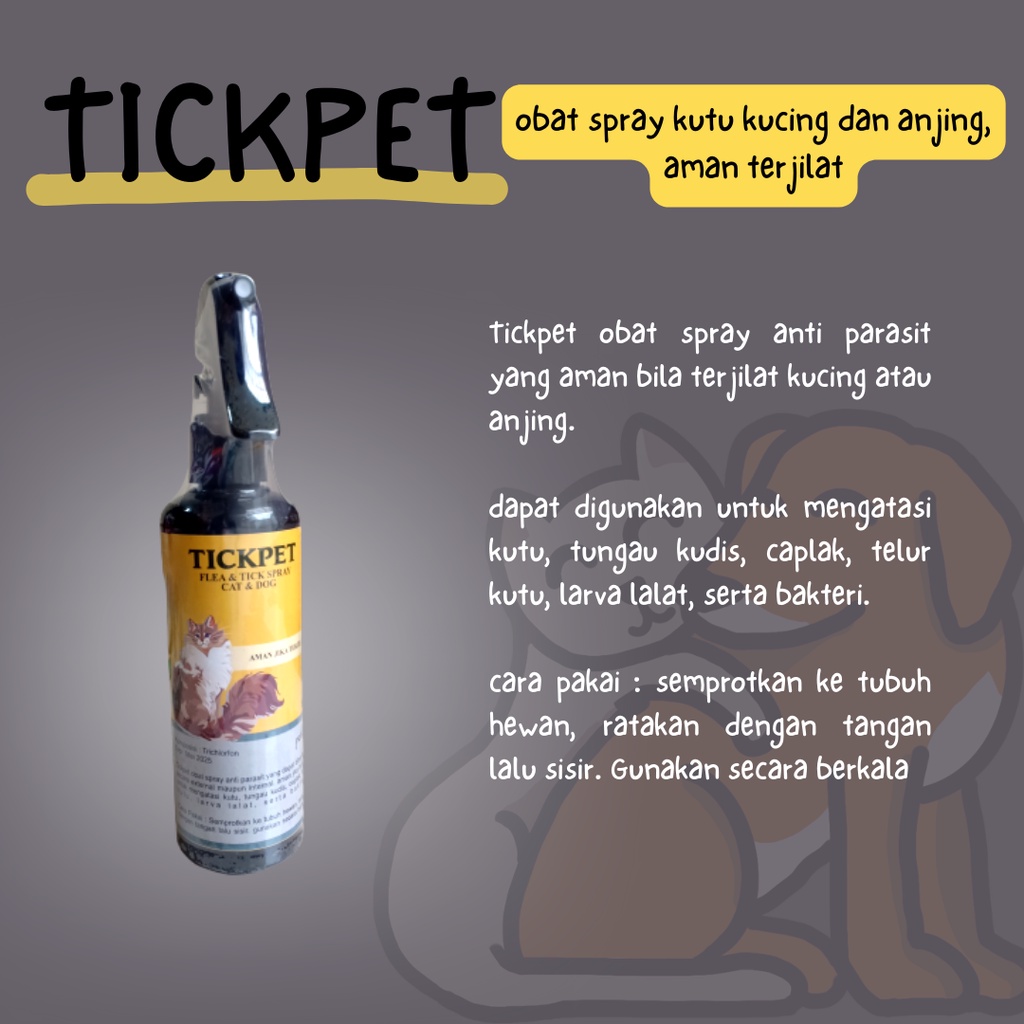 Obat Kutu Kucing Obat Kutu Anjing Spray Kutu Anjing / Spray Kutu Kucing aman terjilat yaa ~ merk : TICKPET ukuran : 240 ml Tickpet obat spray anti parasit yang aman bila terjilat kucing atau anjing, dapat digunakan untuk mengatasi kutu, tungau kudis, caplak, telur kutu, larva lalat, serta bakteri. cara pakai : semprotkan ke tubuh hewan, ratakan dengan tangan lalu sisir. Gunakan secara berkala