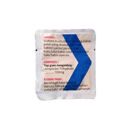 Obat Tabur Luka Kucing merk : Famacillin merupakan obat serbuk untuk mengobati luka terbuka pada hewan peliharaan yang aman dan tidak memberikan efek samping negatif meskipun terjilat oleh hewan. dapat juga mengobati scabies, kudis,eksim, koreng, gatal-gatal yang disebabkan oleh bakteri,jamur,parasit dan kutu,luka bakar,luka terbuka,dan luka habis operasi. komposisi : Tiap gram mengandung : -Amplicilin Trihydrate .............100mg aturan pakai Bersihkan luka terlebih dahulu.Taburkan 2-3 kali sehari pada luka terbuka/luka bernanah.