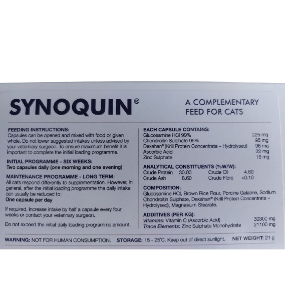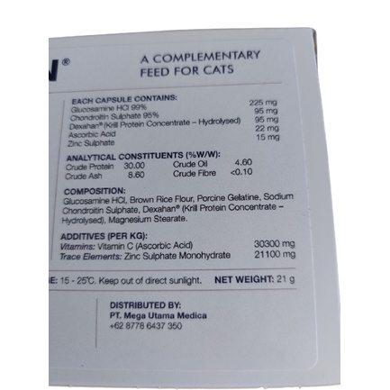 EXP 31 JUL 2023 Suplemen Tulang Kucing Suplemen Sendi Kucing Vitamin Kucing untuk Tulang Vitamin Kucing untuk Sendi Merk : SYNOQUIN EFA HARGA YANG TERTERA UNTUK 1 KAPSUL YA Synoquin EFA Cat, suplemen perawatan sendi terkemuka kami untuk kucing membantu sendi kaku dan meningkatkan mobilitas Synoquin EFA Cat mengandung Dexahan, sumber unik Omega 3 Essential Fatty Acids (EFAs) yang sangat baik untuk ditambahkan ke makanan hewan peliharaan Anda karena memiliki banyak manfaat kesehatan dan sering digunakan untuk membantu manajemen persendian. Dexahan adalah sumber terkonsentrasi dari krill, krustasea kecil dengan manfaat nutrisi yang sangat besar! EFA dalam minyak krill lebih mudah dicerna dan dimanfaatkan oleh tubuh daripada yang berasal dari sumber lain. Mereka berasal dari sumber yang ramah lingkungan, dikemas dengan antioksidan dan tidak menyebabkan hewan peliharaan Anda bernafas amis. Cara penggunaan : dapat diberi makan utuh atau dibuka dan dicampur dengan makanan Dosisi : Program awal (6 minggu): 2 kapsul sehari (pagi dan sore hari) Program pemeliharaan (jangka panjang): dapat dikurangi menjadi 1 kapsul sehari