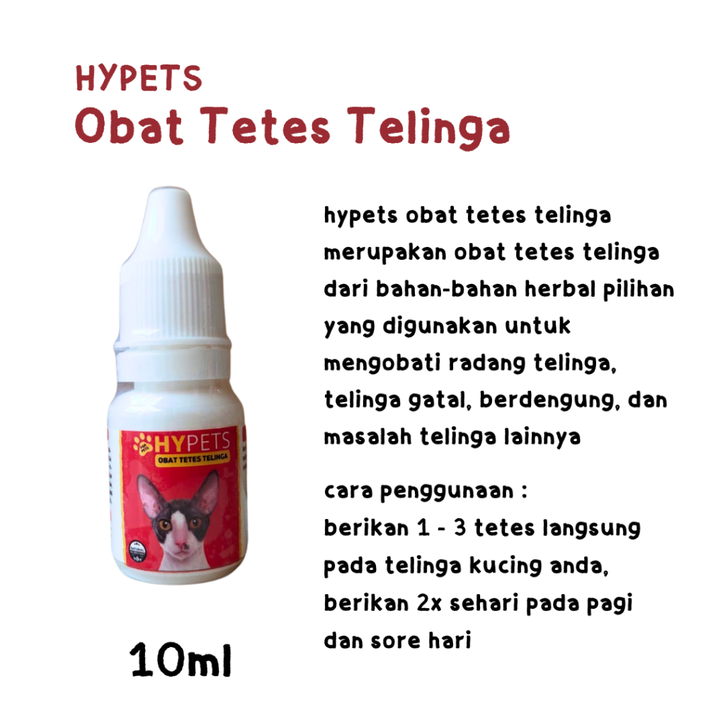 Obat tetes telinga merk : Hypets ukuran : 10ml hypets obat tetes telinga merupakan obat tetes telinga dari bahan-bahan herbal pilihan yang digunakan untuk mengobati radang telinga, telinga gatal, berdengung, dan masalah telinga lainnya cara penggunaan : berikan 1 - 3 tetes langsung pada telinga kucing anda, berikan 2x sehari pada pagi dan sore hari harga yang tertera untuk 1 pcs