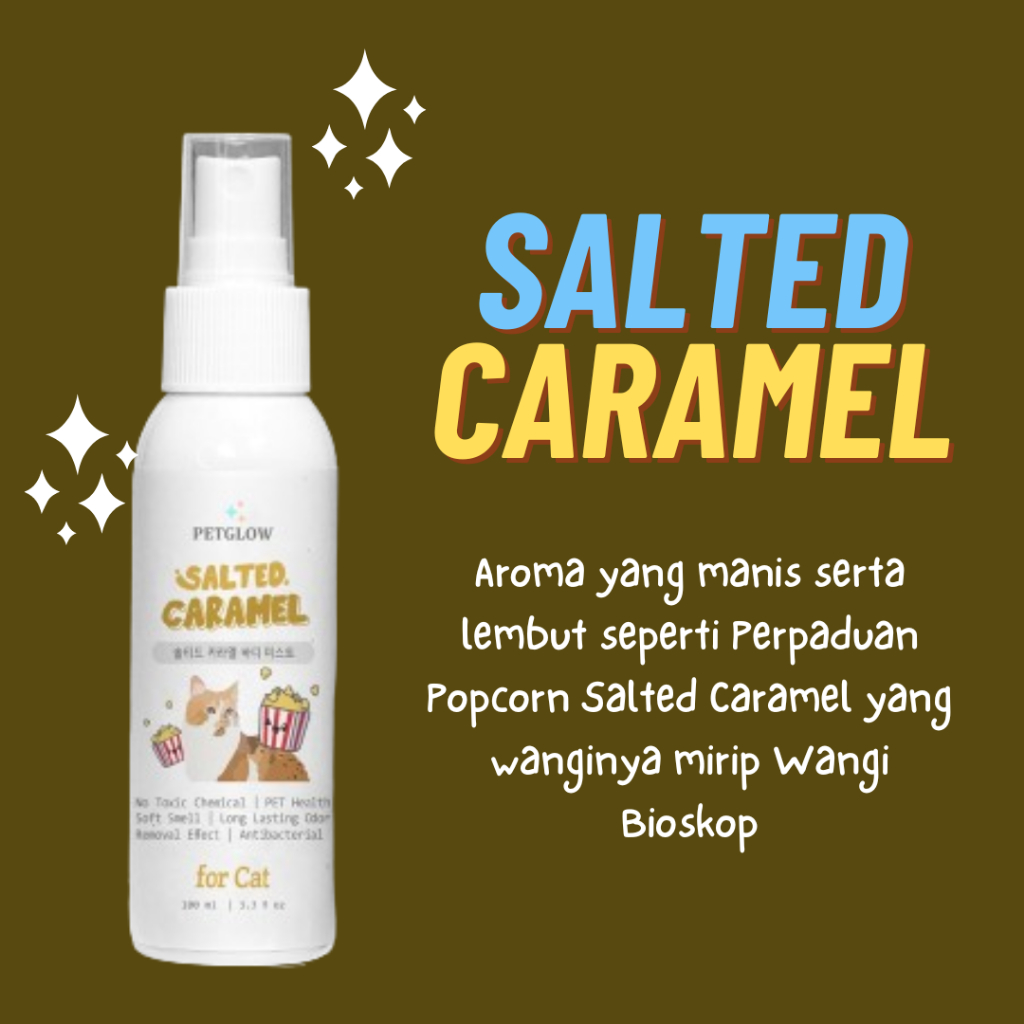 Parfum Kucing Merk : Petglow Ukuran : 100 ml diformulasikan khusus u/ membantu hewan peliharaan-mu menjadi harum sepanjang hari dgn Aroma yg disukai anabul ( Pet Friendly Scent ) yg menyegarkan Dgn Extrak Aloe Vera membantu melembutkan serta mencegah bulu kusut dan rontok pada anabul kesayangan-mu. No Toxic Alcohol Pet Safe Aroma Long Lasting Formula No Toxic Chemical Pet Health Soft Smell Long Lasting Odor Removal Effect Antibacterial Anti Jamur Tersedia dalam 3 varian For Cat : - Salted Caramel : Aroma yang manis serta lembut seperti Perpaduan Popcorn Salted Caramel yang wanginya mirip Wangi Bioskop - Deep Sleep : Aroma klasik lotion bayi yang siap memanjakan-mu - Happy Stress Free : Aroma bunga yang memberikan sensasi fresh dan menyegarkan Cara Pemakaian: 1. Kocok terlebih dahulu sebelum pemakaian 2. Buka tutup pada botol 3. Semprotkan secara merata ke tubuh anabul (Hindari penyemprotan pada bagian wajah) 4. Bantu dengan menyisirkan bulu atau usap menggunakan tangan untuk hasil yang maksimal