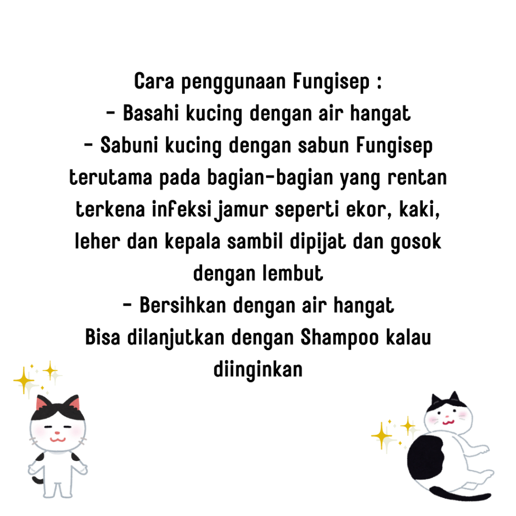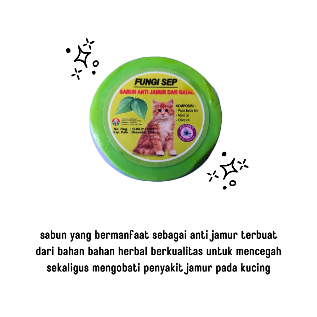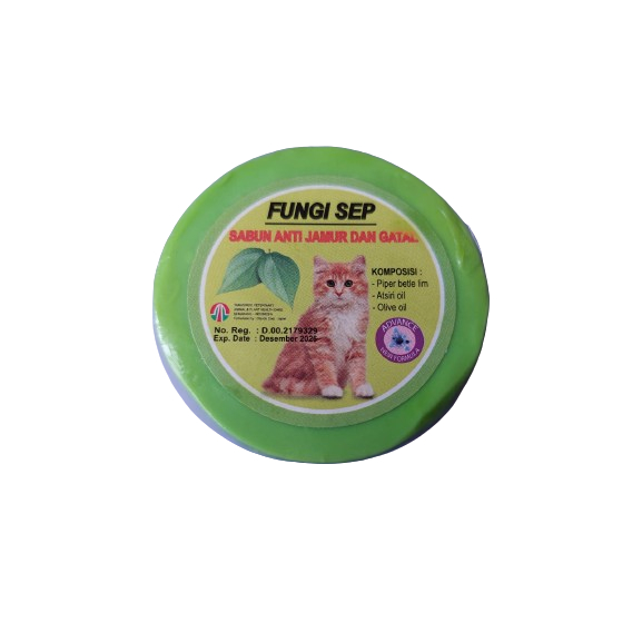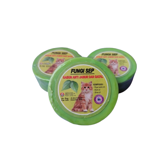Sabun Jamur Kucing Anti Jamur dan Anti Gatal Kucing Merk : FUNGISEP harga yang tertera untuk 1 pcs sabun yang bermanfaat sebagai anti jamur terbuat dari bahan bahan herbal berkualitas untuk mencegah sekaligus mengobati penyakit jamur pada kucing Cara penggunaan Fungisep : - Basahi kucing dengan air hangat - Sabuni kucing dengan sabun Fungisep terutama pada bagian-bagian yang rentan terkena infeksi jamur seperti ekor, kaki, leher dan kepala sambil dipijat dan gosok dengan lembut - Bersihkan dengan air hangat - Bisa dilanjutkan dengan Shampoo kalau diinginkan