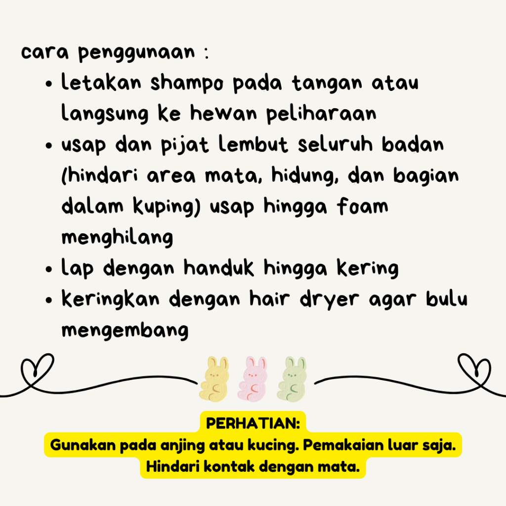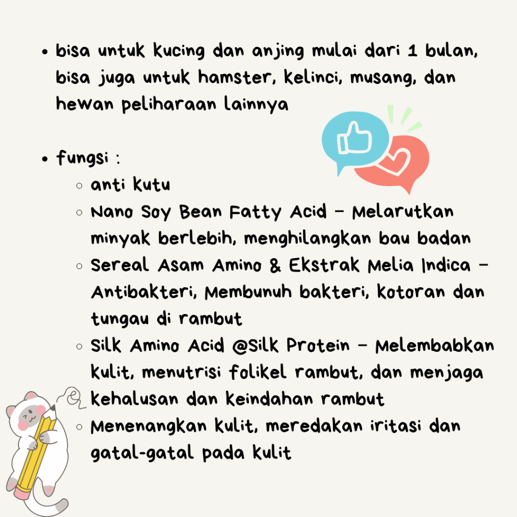 Shampoo Kucing / Anjing DRY SHAMPOO / WATERLESS SHAMPOO BENTUKNYA FOAM YAA (BUSA) Merk : Kin Kand Ukuran : 100ml Wangi : Green Tea dapat digunakan untuk kucing dan anjing mulai dari 1 bulan, juga untuk hamster, kelinci, musang, dan hewan peliharaan lainnya FUNGSI: * ANTI KUTU * Nano Soy Bean Fatty Acid – Melarutkan minyak berlebih, menghilangkan bau badan * Sereal Asam Amino & Ekstrak Melia Indica – Antibakteri, Membunuh bakteri, kotoran dan tungau di rambut * Silk Amino Acid @Silk Protein – Melembabkan kulit, menutrisi folikel rambut, dan menjaga kehalusan dan keindahan rambut * Menenangkan kulit, meredakan iritasi dan gatal-gatal pada kulit CARA PENGGUNAAN : - letakkan shampo pada tangan atau langsung ke hewan peliharaan - usap dan pijat lembut seluruh badan (hindari area mata, hidung, dan bagian dalam kuping) usap hingga foam menghilang - lap dengan handuk hingga kering - keringkan dengan hair dryer agar bulu mengembang