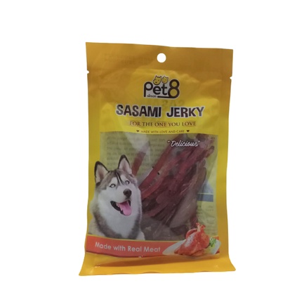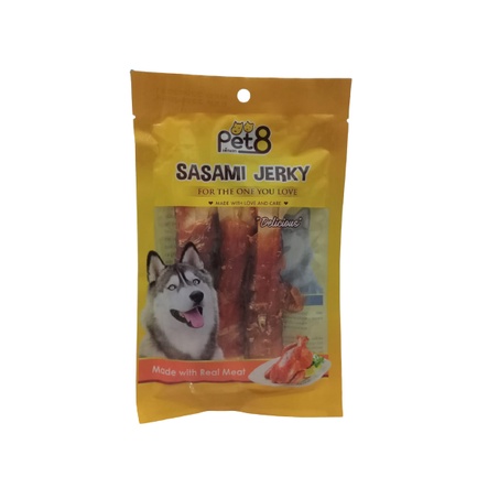 Snack Anjing Cemilan Anjing Dog Treats Merk : SASAMI JERKY - PET8 Ukuran : 50 gr snack anjing yang enak dan mudah dicerna oleh anjing kesayanganmy. tersedia beberapa varian : - JJ01 Chicken fillet Jerky small slices - JJ02 Chicken fillet Jerky big slices - JJ04 Chicken fillet wrap fish strap - JJ08 Soft crunchy stick in Chicken fillet - JJ14 Chicken fillet wrap crunchy Silahkan pilih variasi yang diinginkan, bila ada yang kosong, akan kami konfirmasi lebih lanjut
