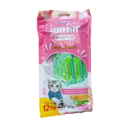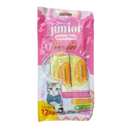 Snack Kucing Liquid Creamy Treats merk : JUNIOR - Creamy Treats ukuran : 4 x 15gr harga yang tertera untuk 1 pack (isi 4 @15gr) silahkan pilih varian yang diinginkan, bila kosong akan kami konfirmasi lebih lanjut