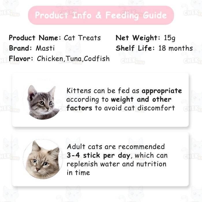 TANGGAL YANG TERTERA = TANGGAL PRODUKSI Expirednya 18 bulan dari tanggal produksi yaa ~~ SNACK KUCING SATUAN Harga yang tertera untuk 1 pcs yaa merk : Masti ukuran : 15gr varian : tuna, cod, chicken varian yang dikirim random yaa ~ *jika ingin varian tertentu, silahkan ditanyakan dl stoknya :)