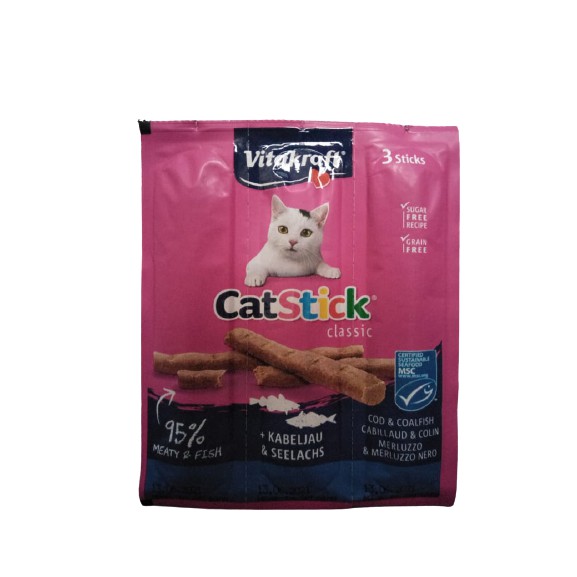 Snack Kucing Stik Snack Kucing Kering Snack Stick Cat Treats Merk : Vitakraft Ukuran : 1 pack isi 3 stik @ 6gr Harga yang tertera untuk 1 pack (3 stik) Tersedia varian : 1. COD + Tuna - ready 2. Poultry + Liver 3. Salmon - ready 4. Duck + Rabbit - bebas gula - tidak mengandugn pewarna atau perasa buatan (snack sehat) - aroma dan rasanya sangat enak karena 95% dari daging dan atau ikan asli Mohon tanya ketersediaan stok dulu yaa untuk variannya. jika tidak ada notes pada pesanan, akan dikirim sesuai stok yang ada.