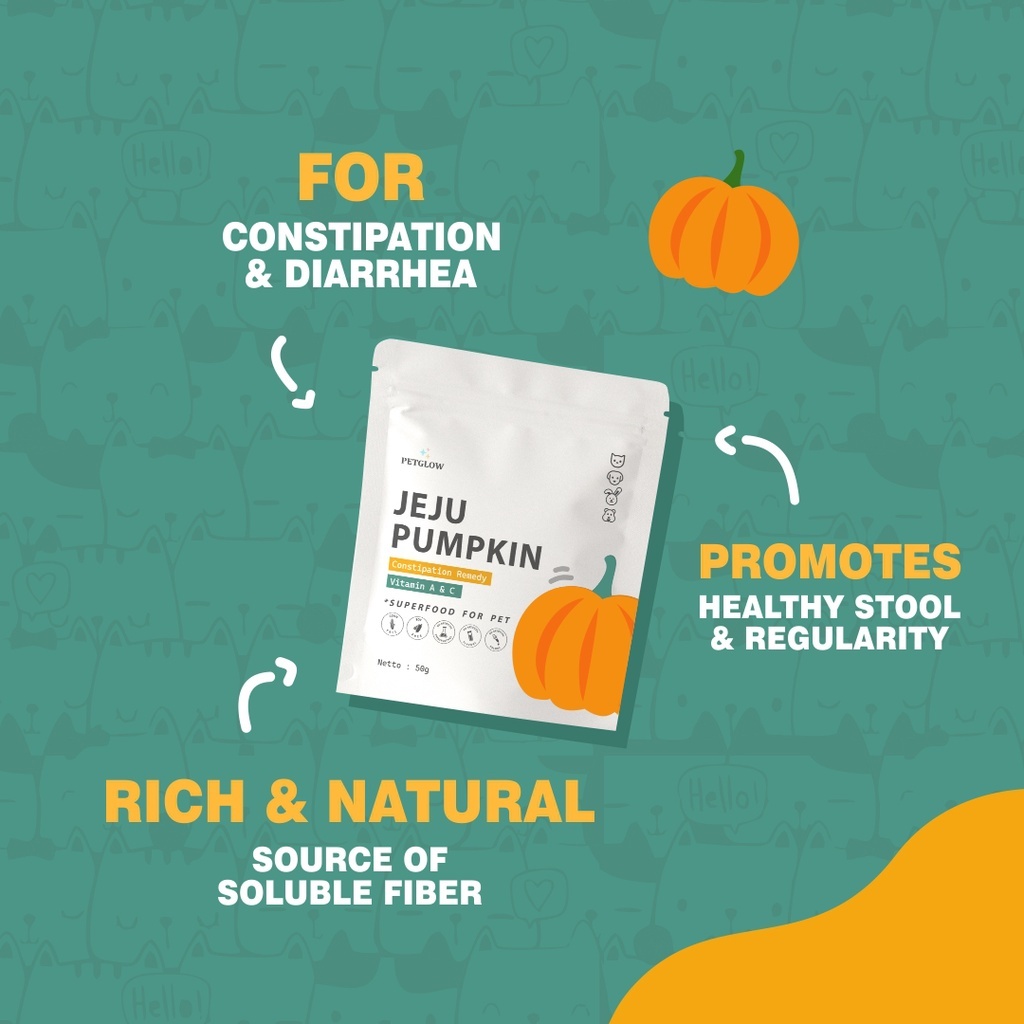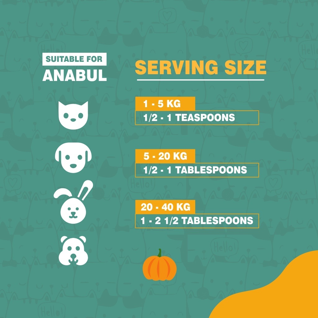 Vitamin Kucing / Anjing / Hamster / Kelinci SUPERFOOD Jeju Pumpkin Labu kuning kaya akan kandungan seratnya dan bisa dikonsumsi untuk mengatasi konstipasi dan diare. Labu memiliki manfaat baik bagi kesehatan hewan peliharaan karena kandungan seratnya dan rendah gula. Anjing bisa memakan labu, tapi perlu diingat jika anabulmu merupakan karnivora. Pola makannya tetap harus didominasi oleh daging, sedangkan bahan makanan lainnya hanya boleh diberikan kurang dari 10% makanan anabul. Cocok untuk hewan peliharaan yang mengalami sembelit, memberikan labu juga bisa mencegah masalah hairballs pada anjing. mampu merangsang gerakan usus hingga meredakan diare, labu bukan hanya mengatasi gangguan pencernaan tapi juga memastikan anjingmu terhindar dari obesitas. Selain jumlah seratnya yang kaya, labu juga kaya akan beberapa vitamin seperti A, C, dan E, dan juga mengandung mineral seperti kalsium, seng dan zat besi. Menurut Dr. Heather Meyers dari Carolina Pets Hospital di Wesley Chapel, North Carolina menyebutkan manfaat vitamin A dan C yang mendukung penglihatan dan kekebalan tubuh. Antioksidan seperti betakaroten dalam labu juga berdampak positif bagi kesehatan Anjing sebagai anti-inflamasi. Selain itu, menambahkan labu ke dalam makanan anabul juga akan mempertahankan penglihatan yang baik selama sisa hidupnya. Porsi Labu untuk Anabul Jumlah labu yang dapat dikonsumsi kucing per minggu tergantung pada berat dan ukuran spesifiknya. Namun, aman untuk mengatakan bahwa kebanyakan anabul hanya memerlukan satu sendok teh labu Sesuaikan dengan ukuran tubuhnya, jika cukup besar bisa mendapatkan 2-3 sendok teh per minggu. Pastikan untuk berkonsultasi dengan dokter hewan sebelum menambahkan labu apa pun ke dalam makanan anjing. Mulai secara perlahan dengan memberikan 1/2 sendok teh untuk anabul yang lebih kecil dan 1 sendok teh untuk anabul dewasa setiap kali makan dan sesuaikan jumlahnya sesuai kebutuhan.