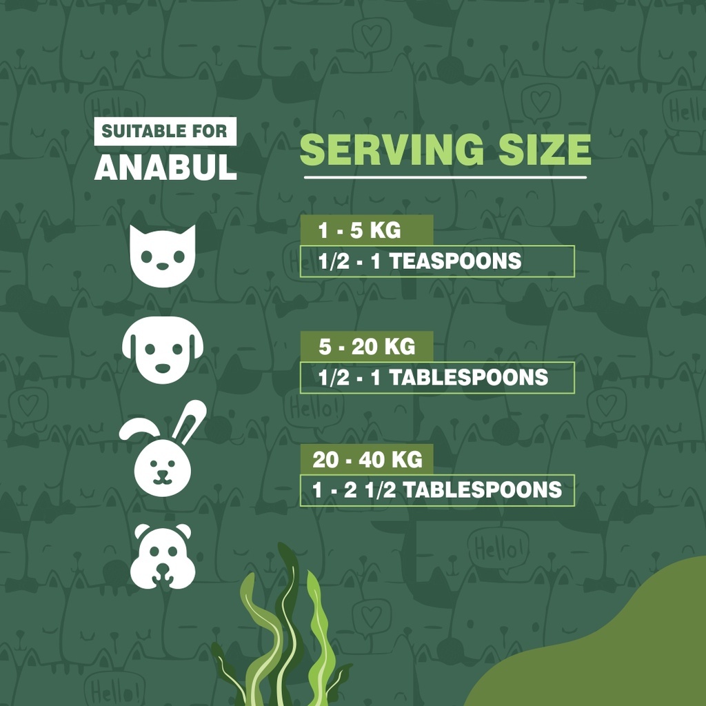Vitamin Kucing / Anjing / Hamster / Kelinci SUPERFOOD Spirulina Spirulina merupakan suplemen yang baik untuk hewan berbulu, terutama bagi induk yang sedang menyusui dan juga untuk anak dan Spirulina dapat membuat kulit anabul menjadi sehat dan menghasilkan bulu yang bersinar. Manfaat Spirulina for Pet ( Anjing, Kucing, Hamster dan Kelinci ) 1.Membuat bulu bersinar dan lebih indah 2.Menyehatkan kulit 3.Mempercepat proses penyembuhan 4.Meningkatkan stamina dan energi 5.Meningkatkan daya tahan/imunitas terhadap segala macam penyakit, mencegah infeksi dan kanker Fungsi Spirulina adalah memberikan kesehatan pada kulit, keindahan pada bulu dan nafas yang segar. Fungsi utama spirulina yang dapat meningkatkan daya tahan tubuh juga sangat berguna bagi kucing yang rawan terserang penyakit yang menyerang disaat daya tahan tubuh kucing sedang menurun seperti parvovirus, distemper, kennel cough, ataupun penyakit kulit demodex. Spirulina dapat diberikan langsung pada kucing atau dapat juga dicampur didalam makanannya. Aromanya seperti aroma rumput laut dan kebanyakan kucing sangat menyukainya.