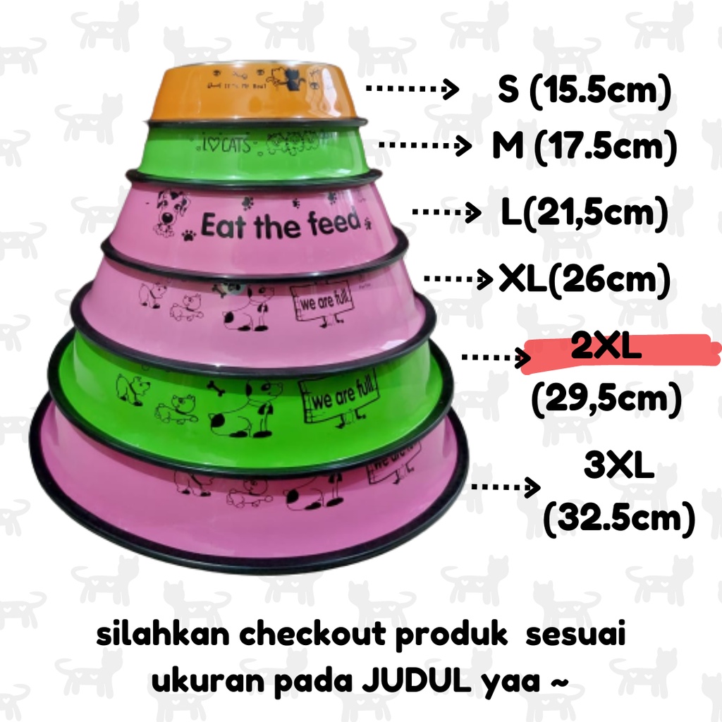 Tempat Makan Kucing / Anjing Ukuran : 2XL diameter dalam : 21.5 cm diameter luar : 29.5 cm ukurannya kurang lebih yaa warna yang dikirim random sesuai stok yang ada ~ tersedia ukuran lain, silahkan dicek pada etalase yaa