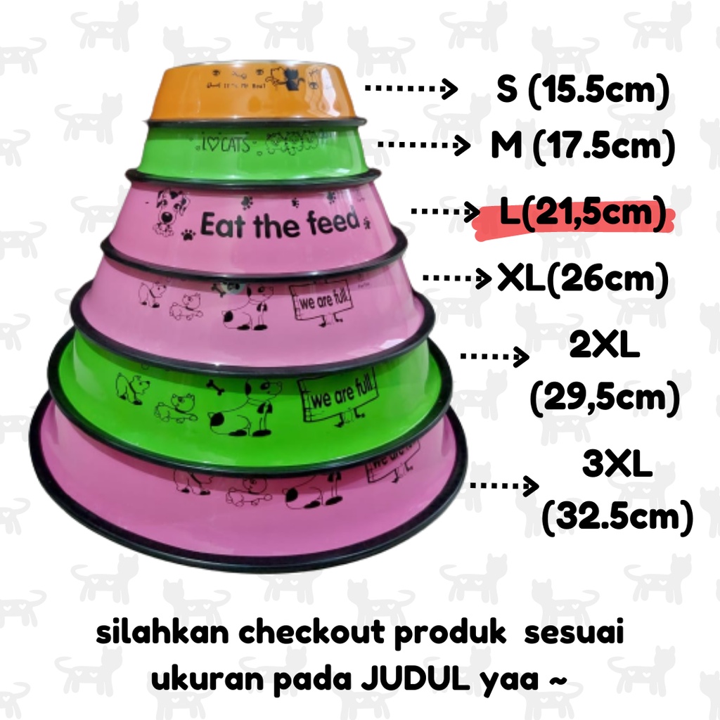 Tempat Makan Kucing / Anjing Ukuran : L diameter dalam : 14.5 cm diameter luar : 21.5 cm ukurannya kurang lebih yaa warna yang dikirim random sesuai stok yang ada ~ tersedia ukuran lain, silahkan dicek pada etalase yaa