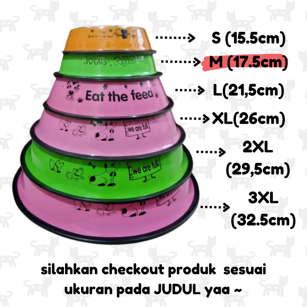 Tempat Makan Kucing / Anjing Ukuran : M diameter dalam : 17.5 cm diameter luar : 12 cm ukurannya kurang lebih yaa warna yang dikirim random sesuai stok yang ada ~ tersedia ukuran lain, silahkan dicek pada etalase yaa