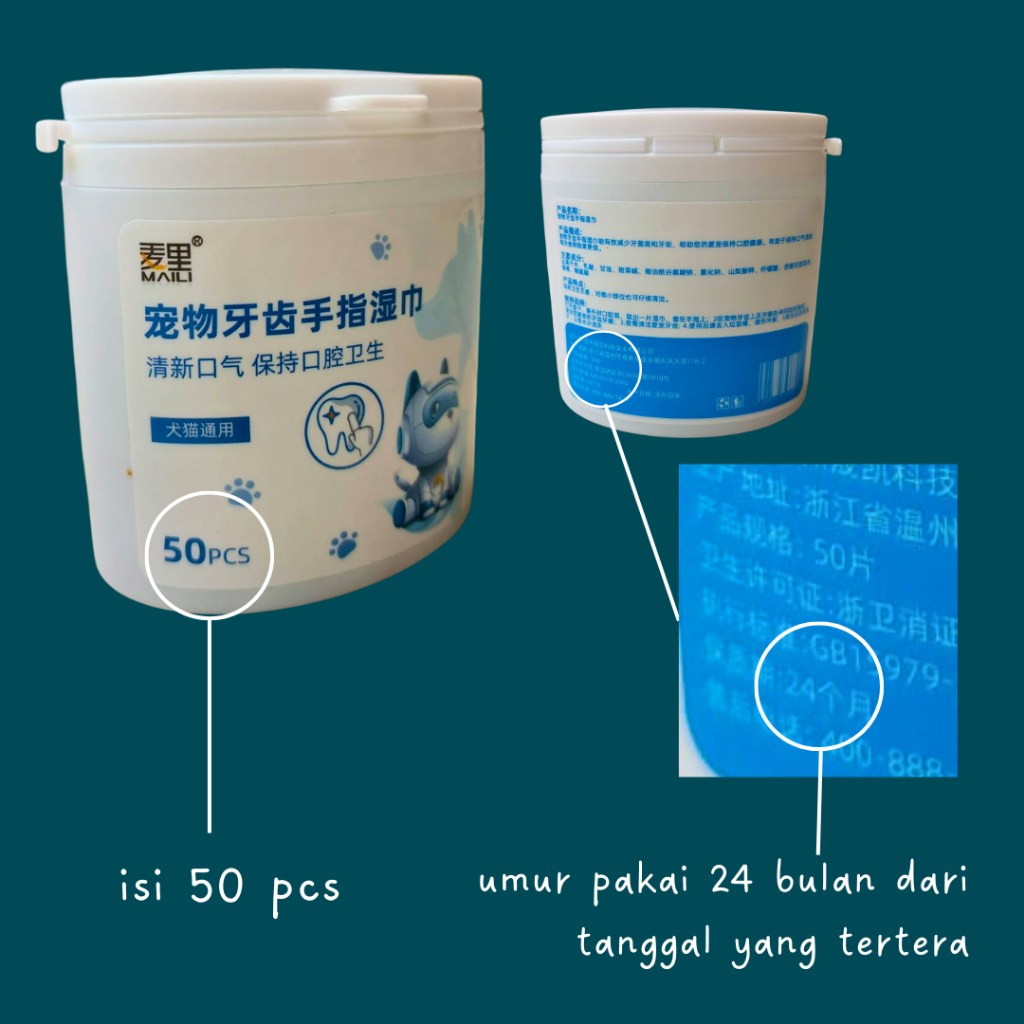Tisu Pembersih Gigi Kucing Tisu Pembersih Gigi Anjing TANGGAL YANG TERTERA ADALAH TANGGAL PRODUKSI, UMUR SIMPAN 24 BULAN DARI TANGGAL PRODUKSI YA ~ harga yang tertera untuk 1 pak isi 50pcs tisu berbentung kantung untuk jari (seperti pada gambar) digunakan untuk membersihkan noda pada gigi kucing / anjing
