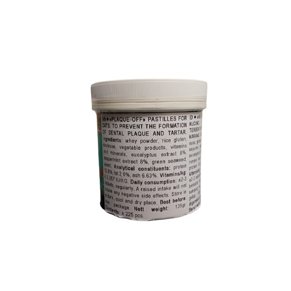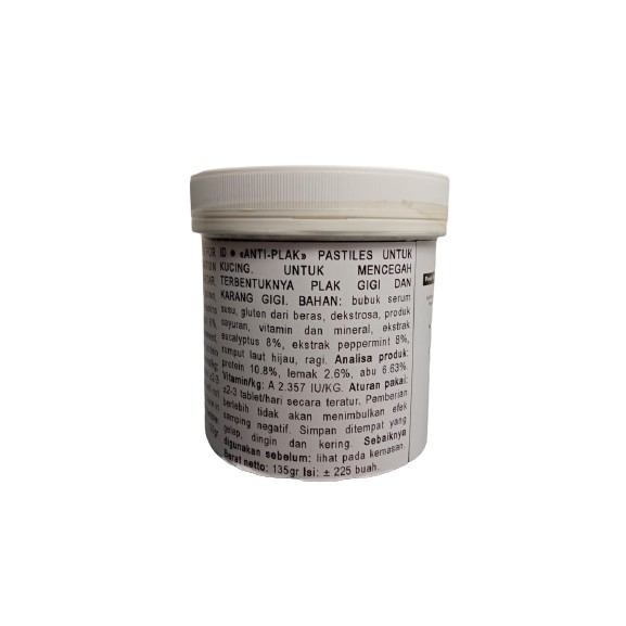 Vitamin Kucing Suplemen Kucing Vitamin Kesehatan Gigi Kucing Merk : KIS KIS PLAQUE OFF REPACK (isi 5 butir) harga yang tertera untuk 5 butir vitamin yaa digunakan untuk : - mencegah terbentuknya plak gigi dan karang gigi - mengatasi bau mulut, plak, tartar, dan karang gigi, dapat dikonsumsi oleh kucing semua usia (all life stages) - mengandung bahan alami untuk menyegarkan mulut - mencegah noda kekuningan dan kecokelatan pada gigi - mengurangi perkembangan bakteri dalam mulut - dapat meningkatkan nafsu makan anjuran pakai : 2 - 3 tablet / hari secara teratur kitten 2 - 6 bulan 1 tablet / hari