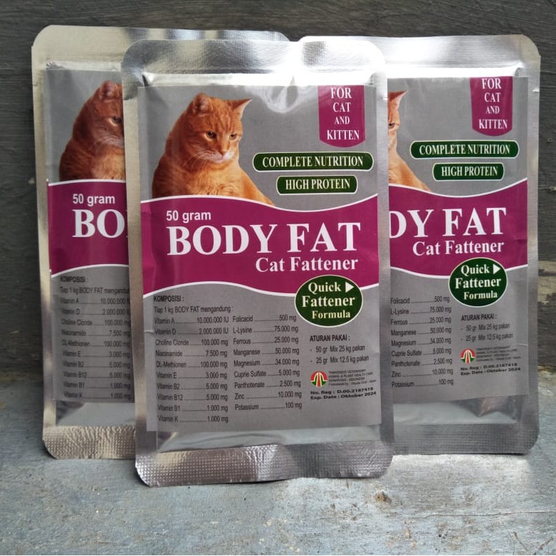 Penggemuk Kucing / Cat Fattener Tinggi Protein Produksi : Tamasindo aman di gunakan untuk kitten dan adult, cara pakai : campur di makanan basah sesuai takaran. Body Fat merupakan multi vitamin pengemuk kucing yang bekerja EXTRA CEPAT untuk menggemukan kucing peliharaan. Body Fat juga baik digunakan untuk kucing yang tidak nafsu makan akibat baru saja mengalami sakit atau stress. Cara pakai yang dianjurkan : 1 sendok teh untuk 1 KG pakan, atau Seujung sendok teh untuk 1 sachet pakan 85gram ** dianjurkan untuk menggunakan dosis kecil lalu dinaikan perlahan NOTES : - TIDAK DIANJURKAN UNTUK MENYUAPI LANGSUNG KE MULUT - TIDAK DIANJURKAN UNTUK MELEBIHI DOSIS