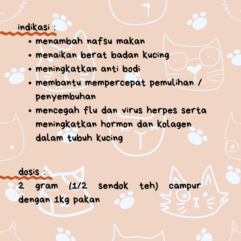 Vitamin Kucing Vitamin Penggemuk Kucing Merk : Kitty Fat Ukuran : 50gr untuk 2 bulan ke atas indikasi : - menambah nafsu makan - menaikkan berat badan kucing - meningkatkan antibodi - membantu mempercepat pemulihan - mencegah flu dan virus herpes serta meningkatkan hormon dan kolagen dalam tubuh kucing dosis : 2 gram (1/2 sendok teh) dicampur 1 kg pakan