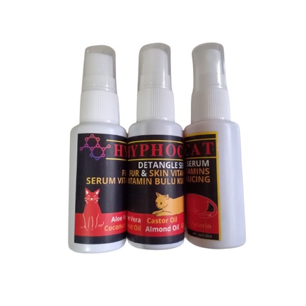 Vitamin Bulu Kucing merk : HYPOCAT ukuran : 30 ml HYPOCAT merupakan serum untuk bulu kucing agar sehat, tidak mudah rontok, berkilau, dan lebat. HYPOCAT memiliki kandungan berbagai essentials oil premium seperti Castor Oil, Sweet Almond Oil, Olive Oil, Coconut Oil, Glycerin, Aloevera, dan masih banyak lagi. KEUNGGULAN: - Memperbaiki bulu kusut, kusam, kering, atau kasar - Melebatkan bulu - Menjaga bulu agar tidak kering - Mengatasi rontok bulu - Membantu menumbuhkan bulu - Merawat kulit dan bulu - Aroma wangi alami dari essentials oil CARA PAKAI: - Kocok terlebih dahulu setiap ingin digunakan - Semprotkankan langsung ke bulu kucing atau bisa juga semprotkan ke telapak tangan lalu oleskan ke bulu dan kulit kucing - Lakukan rutin minimal 2 hari sekali, jika ingin hasil lebih maksimal lakukan setiap hari