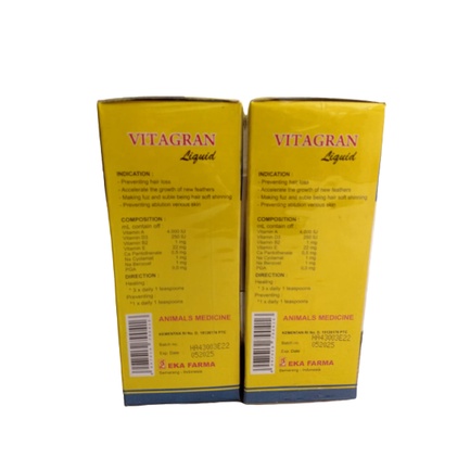 Vitamin Anjing Vitamin Bulu Anjing Merk : VITAGRAN Ukuran : 120ml Bentuk CAIR indikasi : - mencegah kerontokan - mempercepat pertumbuhan bulu anjing - membuat bulu lebih halus dan mengkilat - mencegah terjadinya penyakit kulit aturan pakai : pengobatan : - setiap hari diberikan : 3 x 1 sendok teh pencegahan : - setiap hari diberi 1 x 1 sendok teh KOCOK DAHULU SEBELUM DIPAKAI hanya untuk hewan
